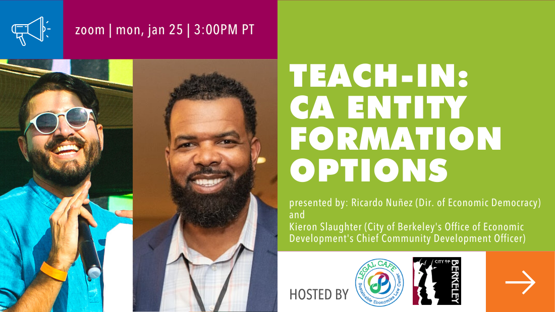 In this teach-in our Director of Economic Democracy, Ricardo Nuñez, will provide an introduction to what legal entities are and the pros and cons of choosing one legal entity over another for California based worker cooperatives.