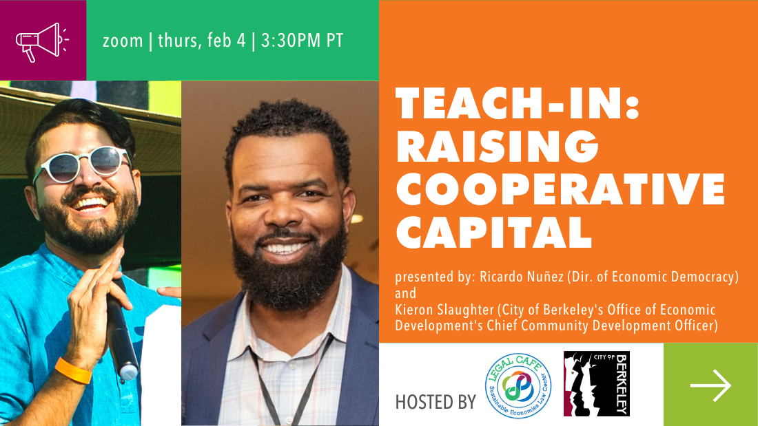 How can cooperatives raise capital that aligns with their values and do it legally? When worker cooperatives are trying to raise capital for their cooperative, they can get in a lot of trouble when they come up against a little thing called "securities law." Also, many worker cooperatives find it difficult raising capital that aligns with their cooperative values, one of which is member control of the cooperative (and not outside investors!). In this teach-in our Director of Economic Democracy, Ricardo Nuñez, will orient worker cooperatives and their supporters to the considerations around raising cooperative capital in California. He'll cover